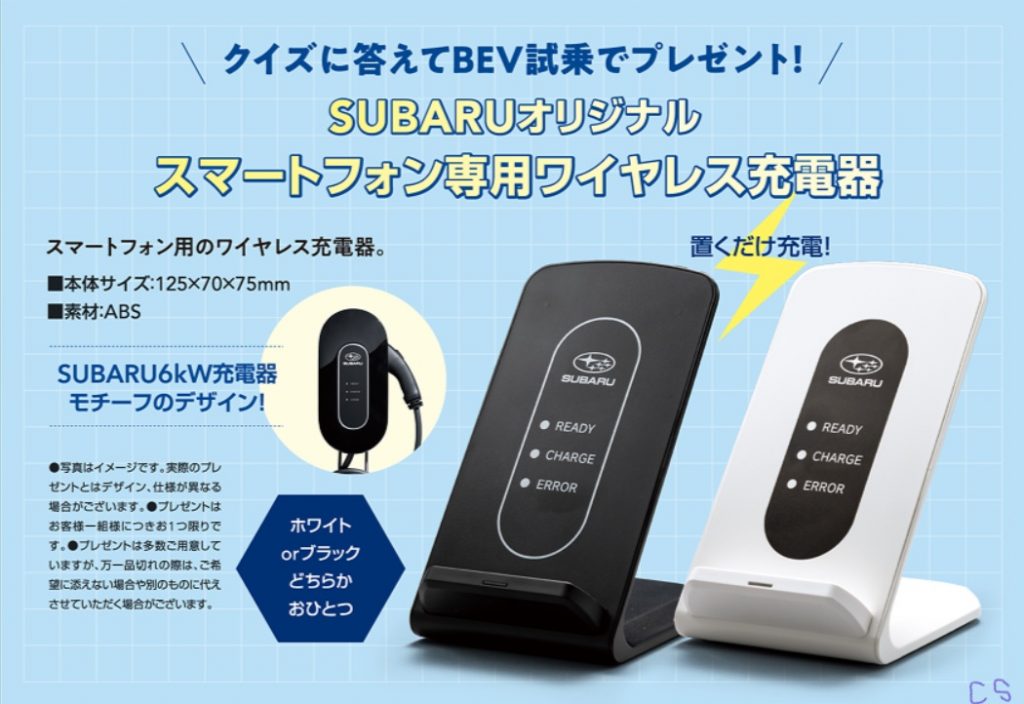 クイズに答えてBEV試乗またはお見積りでスマートフォン専用ワイヤレス充電器プレゼントがあります。