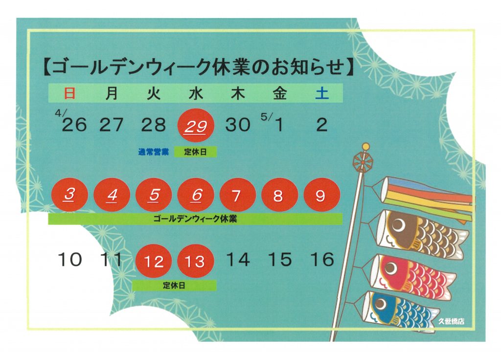 ★ゴールデンウィーク休業日のお知らせ★